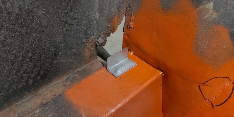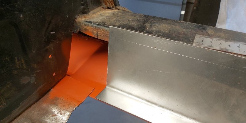 Plåten som saknas på vänster tröskel har, precis som den högra delen hade, fel vinkel. Genom att lägga plåten på en träregel så bocken pekar upp i l...